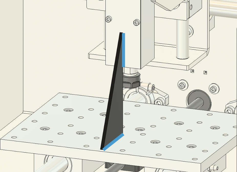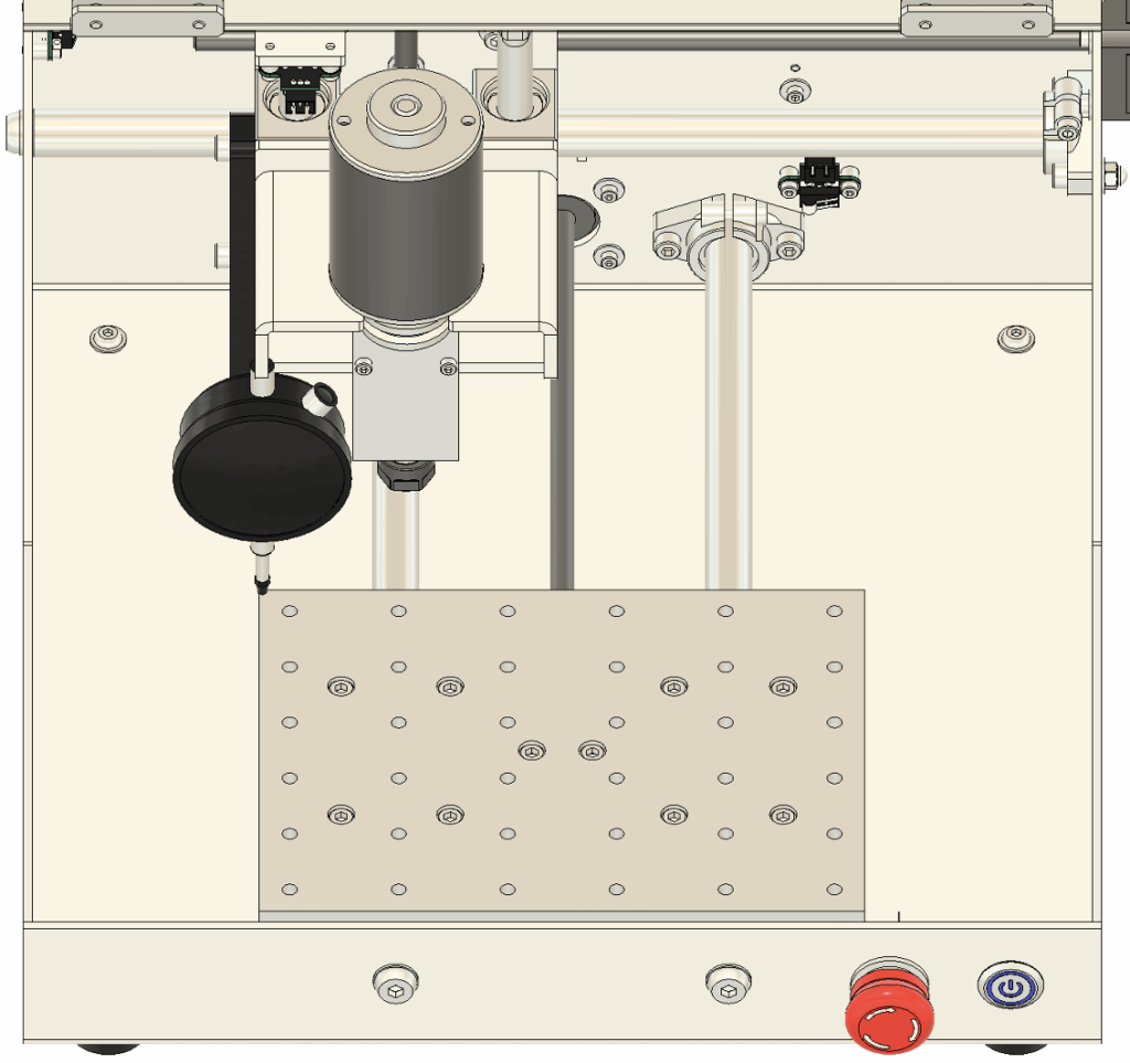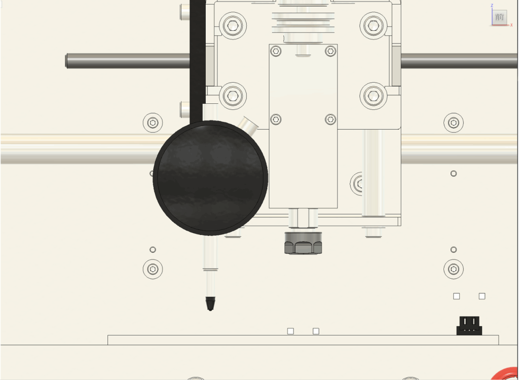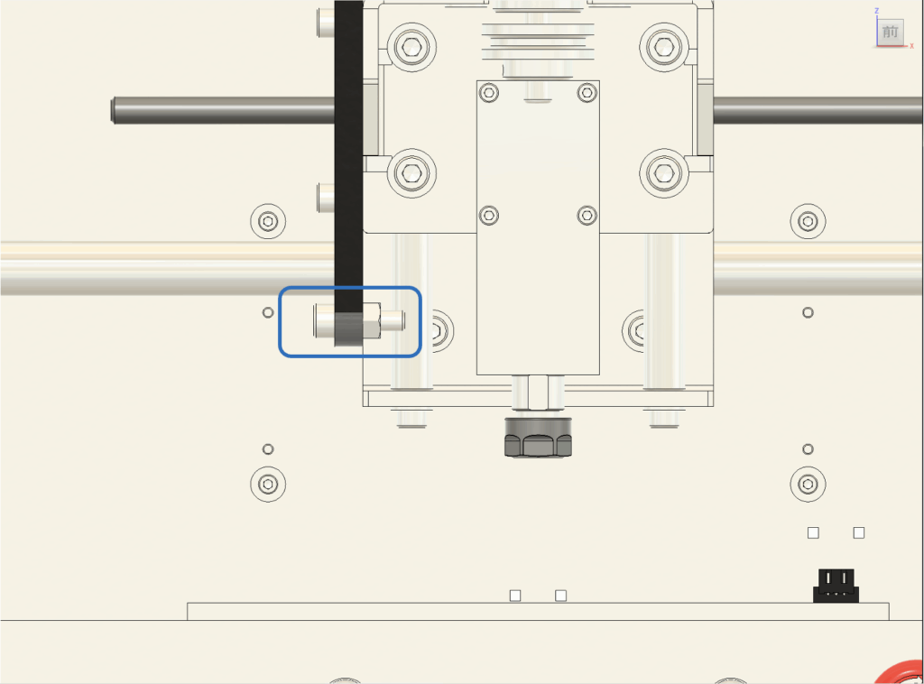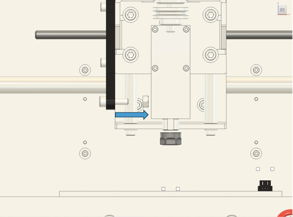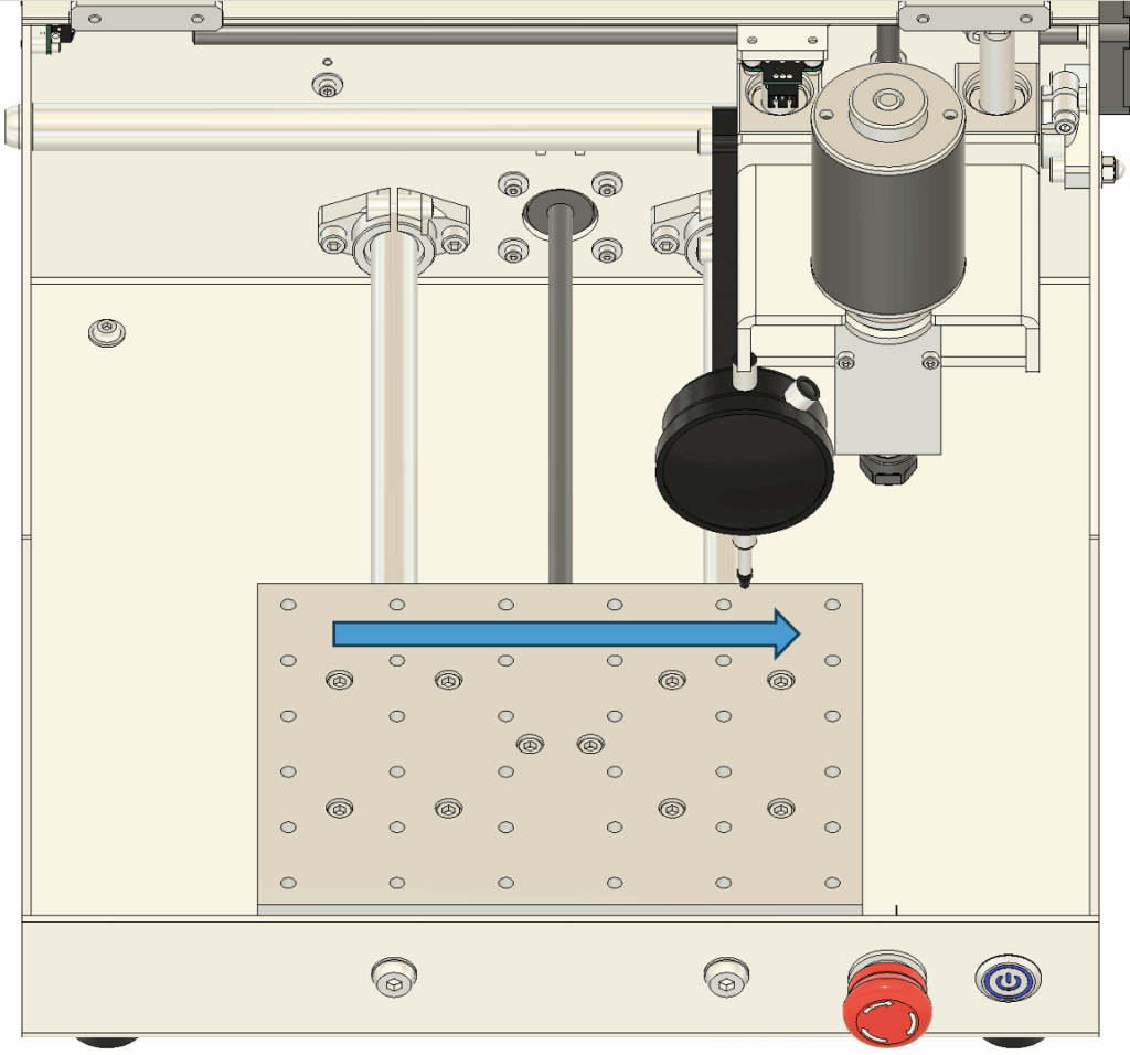 2. 傾きの調整 テーブルの傾きが確認された場合は、以下の手順で調整します。 まず、図に示されている**図9のネジ(青い四角で囲まれた部分)**を少しだけ緩めてください。次に、リニアシャフトを手で軽く動かし、スピンドルと加工テーブルが平行になるように調整します。