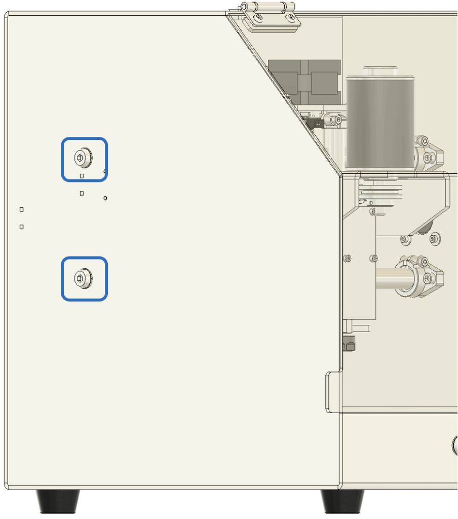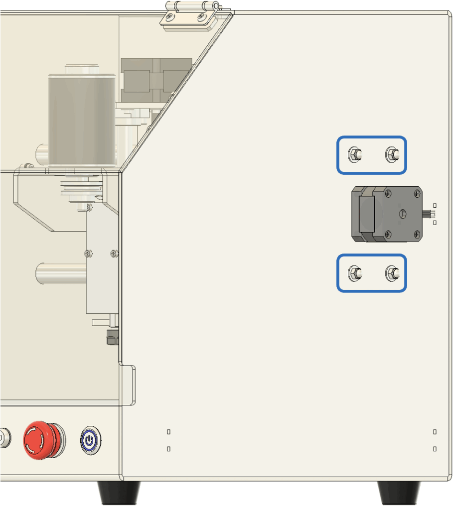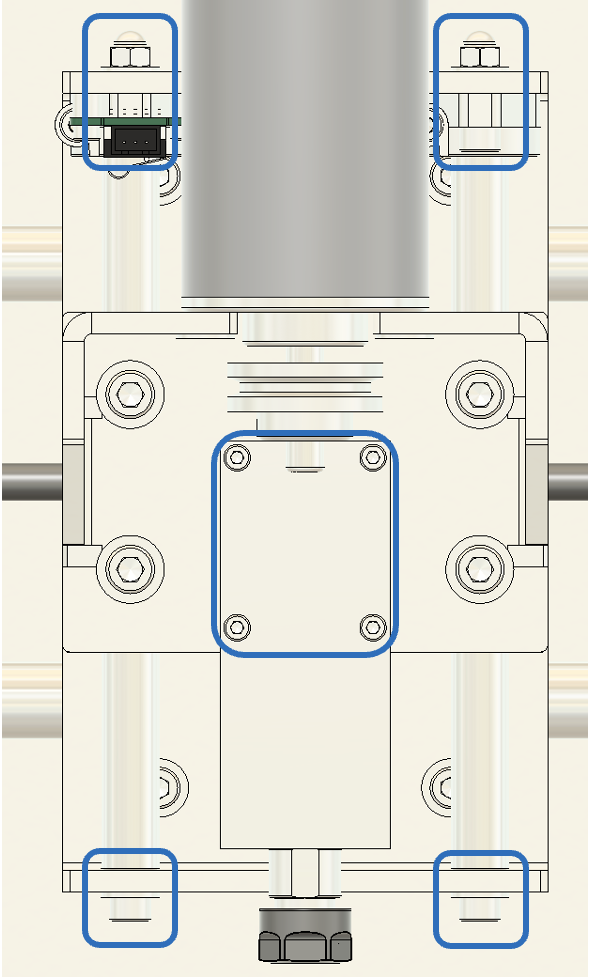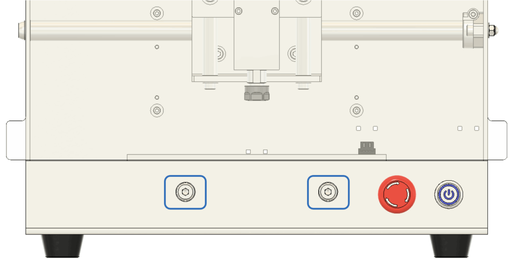 2. 傾きの調整 テーブルの傾きが確認された場合は、以下の手順で調整します。 まず、図に示されている**図6のネジ(青い四角で囲まれた部分)**を少しだけ緩めてください。次に、リニアシャフトを手で軽く動かし、スピンドルと加工テーブルが平行になるように調整します。