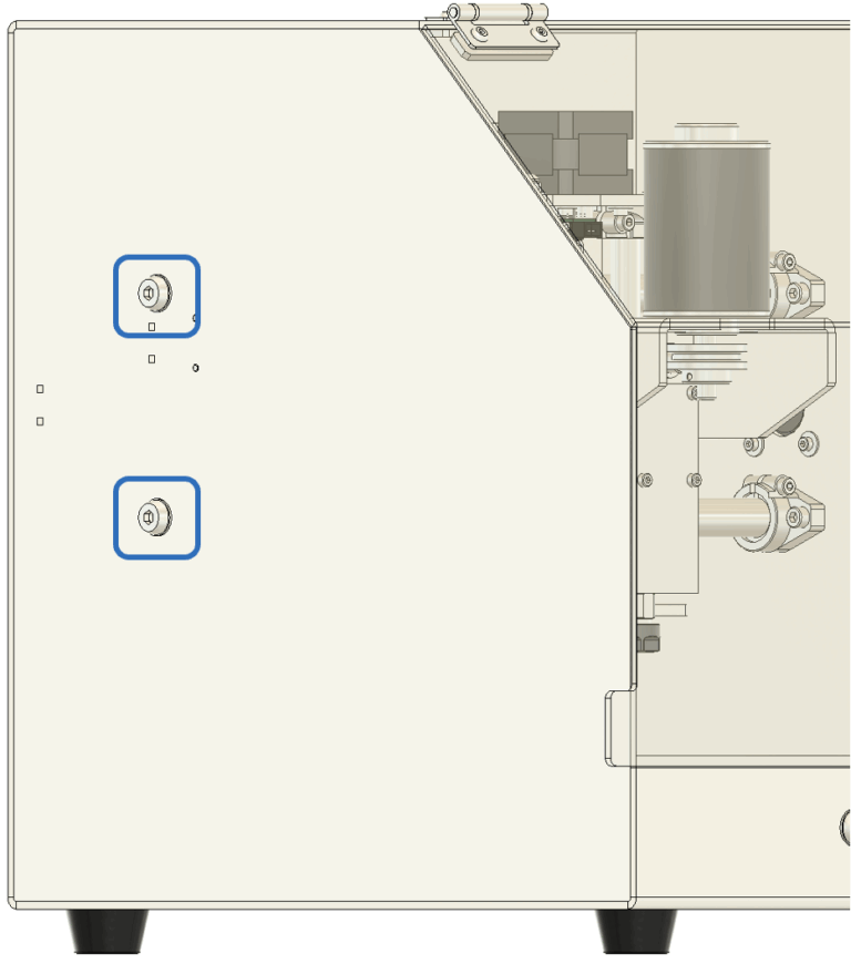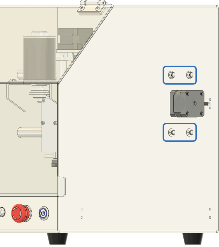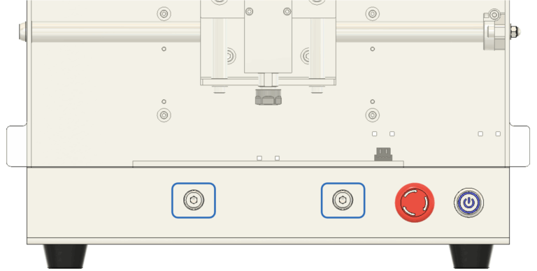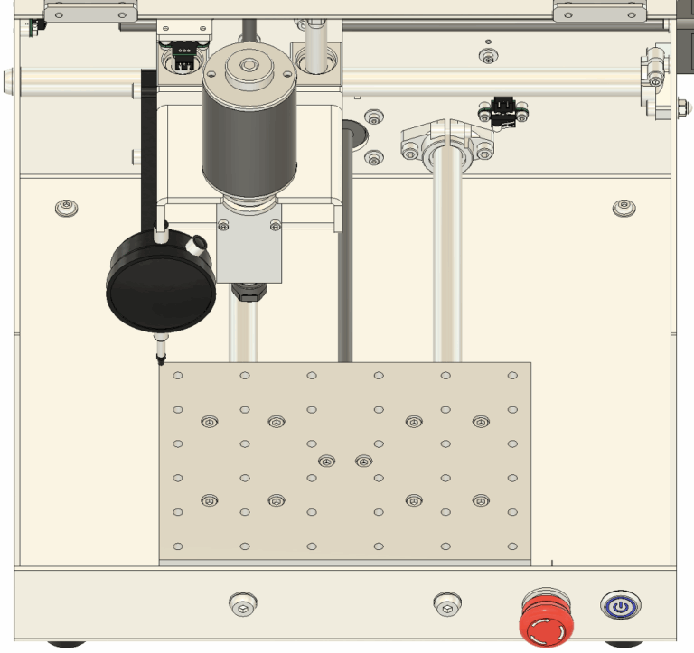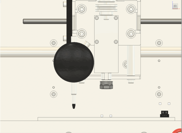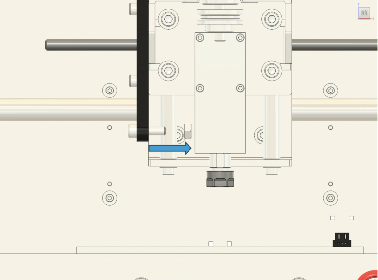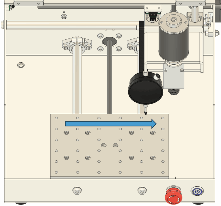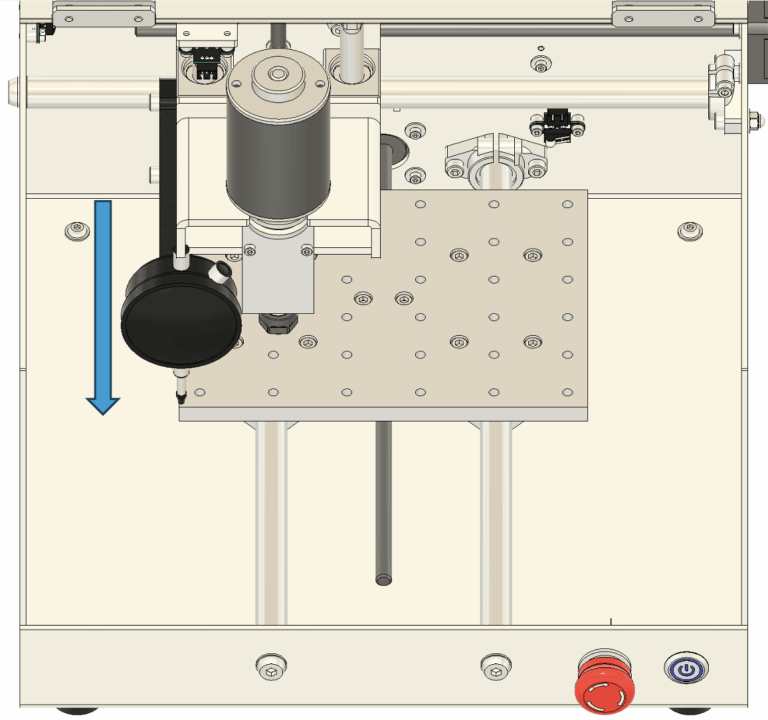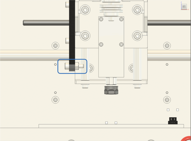 2. 垂直の調整 垂直が出ていない場合は、図11に示されている青い四角で囲まれたネジを緩めて調整します。 基本的には、スピンドル本体を固定している中央の4本のネジを少し緩めるだけで調整できます。 手でスピンドルの角度を微調整し、三角定規が隙間なくぴったりと密着するようにしてください。