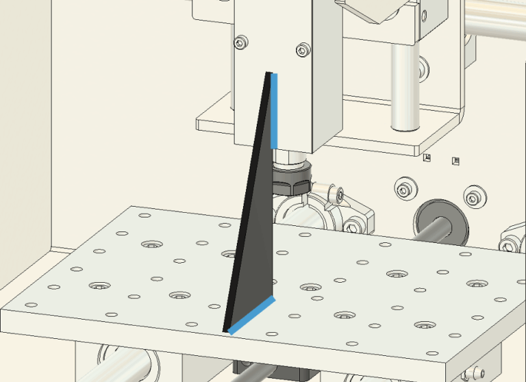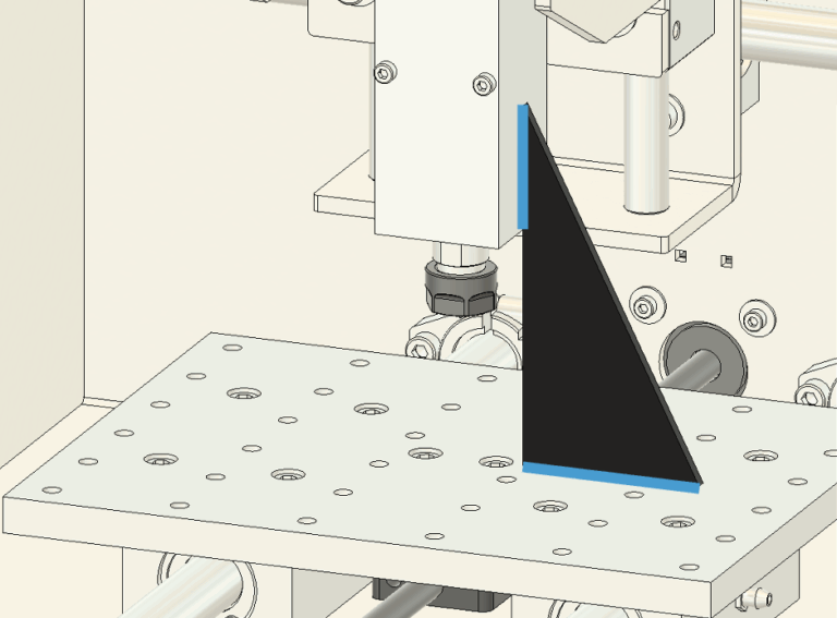 1. 垂直の確認 図10のように、スピンドルと加工テーブルの間に三角定規を当てて、両者が垂直になっているかを確認します。 説明書で青い辺で示されている接触面に注目してください。この青い辺の部分に隙間ができて三角定規がぴったりと密着しない場合、垂直が出ていない証拠です。