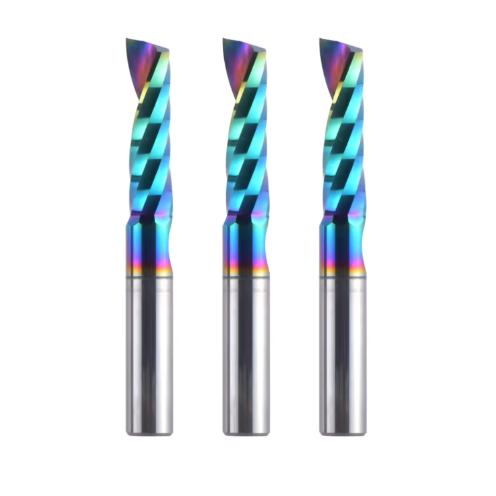 アルミやアクリルなどの素材は、熱を持つと溶けて刃に張り付きやすく、それが原因で刃が折れるトラブルが多発します。 本製品は、「1枚刃」にすることで切り屑を捨てるスペースを大きく確保し、さらに摩擦係数が極めて低い「DLCコーティング」を施しています。これにより、スムーズに切り屑を排出し、溶着や詰まりを防ぎます。